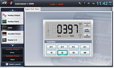 Click on the Digital Multi Meter screen and connect terminal 1c of Circuit-1 to the Multimeter High terminal of a face panel. After connecting terminal 1g and the Multimeter Low terminal of the face panel, record the resistance R1+R2 value measured by a multiplier in the Table 2-1