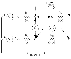 3. 검류계의 지시가 "0"이 되도록 정밀 조정한다. 즉 balance 상태가 되도록 한다. (이때, "GAIN"은 시계방향으로 최대가 되도록 한다.) 그리고 전류와 전압을 측정하여 표 1-5 실험-1의 각 해당란에 기록한다.