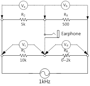 2. 검류계 대신 이어폰을 연결시킨다. 그리고 소리가 들리지 않도록 RB를 조정한다. 즉 balance 상태가 되도록 한다.